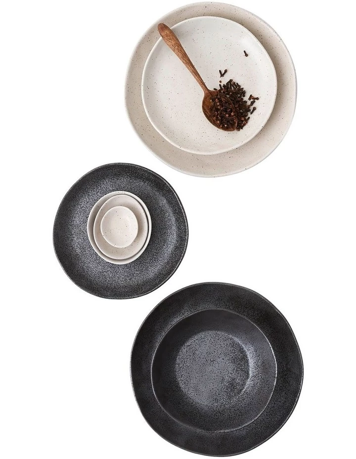 Hospitality grade, high-fired porcelain dinnerware collection in a reactive glaze, Earth is available in black and natural colourway.