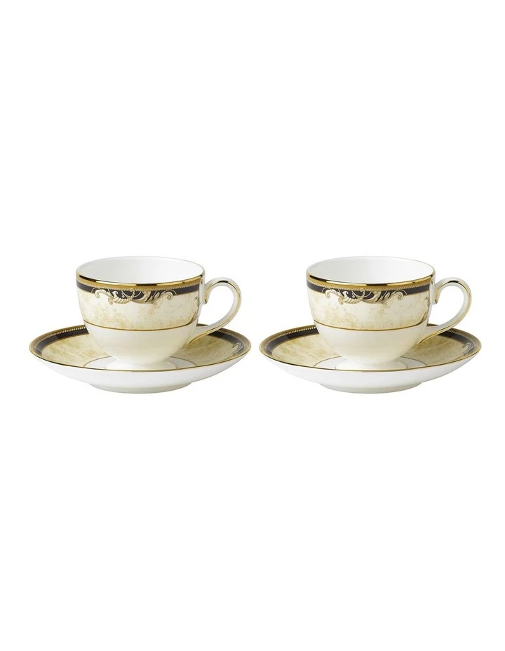 Twirling vine of mythical whirl of unicorns, satyrs, monkeys and scrolled horns draws inspiration from the mythical horn of plenty which brings good fortune to those who receive it. Banded in ivory parchment and dark navy with 22 ct gold rim. Like the mythical horn of plenty, Cornucopia is full of styling possibilities or reflect your mood and personality. Choose the dramatic midnight blue background for drama and excitement.