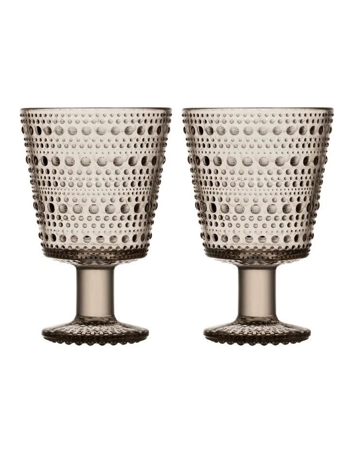 Design legend Oiva Toikka was exploring ways to hide joint marks in glass when he invented the groundbreaking raised droplet design that makes Kastehelmi so distinct. Kastehelmi features rings of delicate glass bubbles designed to resemble strings of dewdrops glistening under the sun. Each piece plays with light in a way that showcases the reflective beauty of the glass. Iittala’s beloved Kastehelmi collection offers a wide range of versatile pieces that are both functional and decorative. Kastehelmi universal glass with stem is suitable for any cold drinks and ideal for everyday use both indoor and outdoor. Delicate yet sturdy drinkware that suits any table setting. Linen adds harmonious elegance. The 2 pc glassware set makes a great gift.