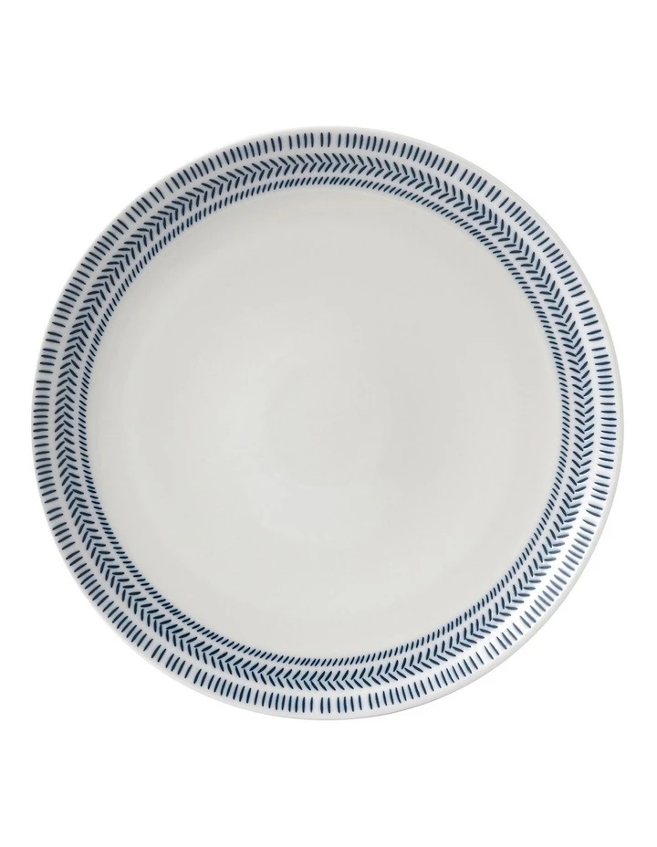 White ceramic dinner plate 28cm featuring the unique hand drawn chevrons and lines pattern debossed in a vibrant cobalt blue on the rim. Dishwasher and microwave safe this is the cornerstone of the range and easily mixes and matches with other pieces for casual home entertaining.