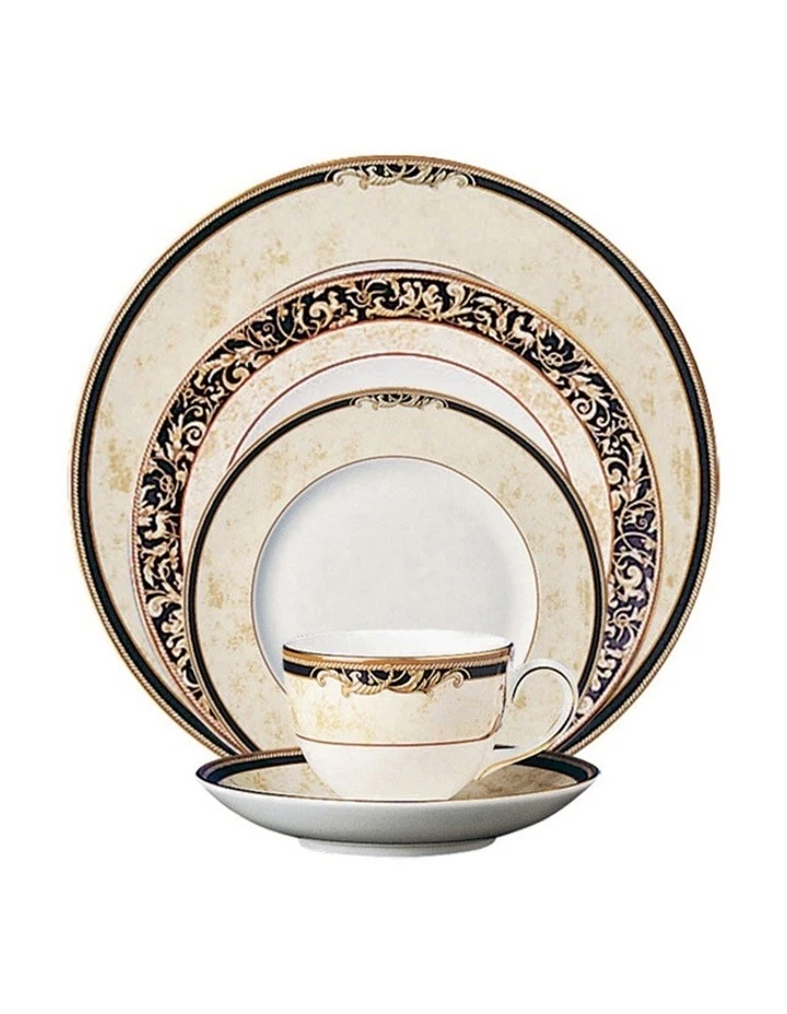 Inspired by the mythical ‘Horn of Plenty,’ the Cornucopia collection is characterised by designs featuring legendary creatures like unicorns and satyrs. All made from fine bone china whiteware and decorated with wide bands of ivory parchment, ribboned by dark navy, roped with an ochre accent and rimmed in lustrous 22-carat gold.