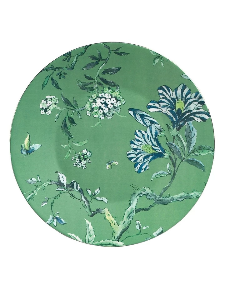The innovative interpretation of the 18th century British trend for patterns from the East Jasper Conran Chinoiserie Green features an exquisite pattern of exotic flowers, foliage and birds set against a richly toned backdrop edged in platinum. Set against a wooden table with colourful flowers, silver cutlery and white linen this is a decidedly modern way to create a formal dining statement.