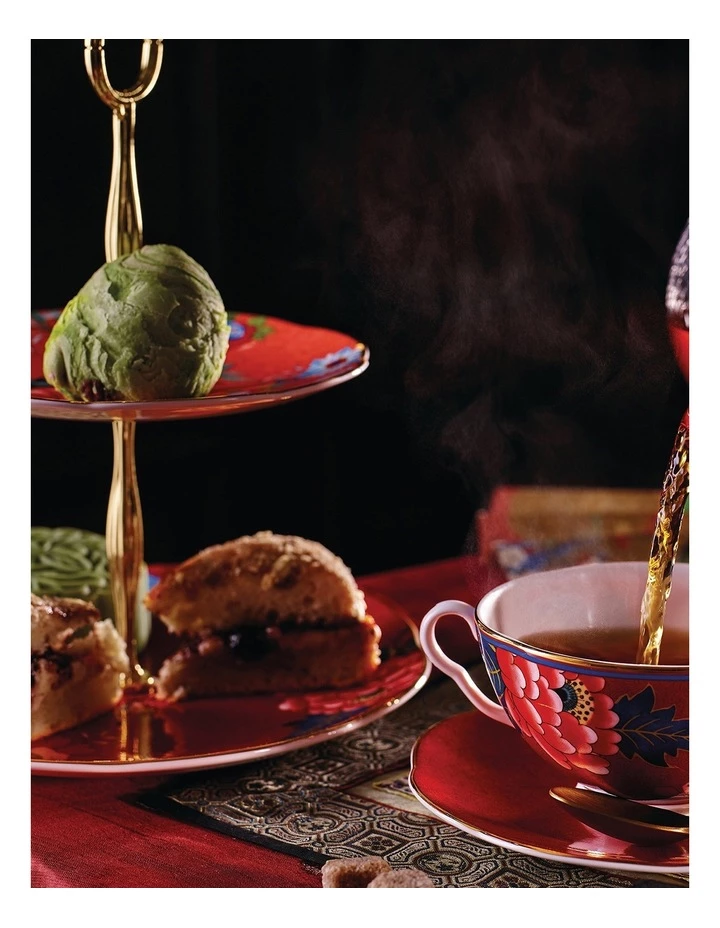Host an afternoon tea in opulent style with the Paeonia Blush Two Tier Cake Stand. A striking piece, inspired by an obsession with the Orient and the tea-drinking experience. Vivid red and coral plates are detailed with peonies and floral detailing. The Paeonia Blush collection is an eclectic mix of gifts and teaware, all forming a celebration of the peony. Paeonia is the botannical name for the Peony. A historic flower dating back thousands of years, the peony is known as the flower of riches and honour. With its lushous and rounded blooms, peonies have come to represent romance and prosperity, and are widely regarded as an omen of good fortune and happy marriage. The original artwork for this collection derives from the first series of pattern books, dating back to the 18th Century. Designed in the Chinoiserie style, popularised in the eighteenth and nineteenth century by an obsession with the Orient , the style imagines the region to be a realm of giant flowers, tiny trees, temples, pagodas, extra-ordinary birds and flocks of outstanding butterflies. For Europeans of the time, the style juxtaposes the new and exotic, with a rich culture thousands of years in the making. Discover the whole Wedgwood collection for afternoon tea, featuring teacups and saucers, teapots, cake stands and even ice cream bowls.
