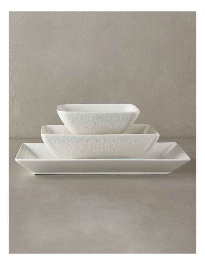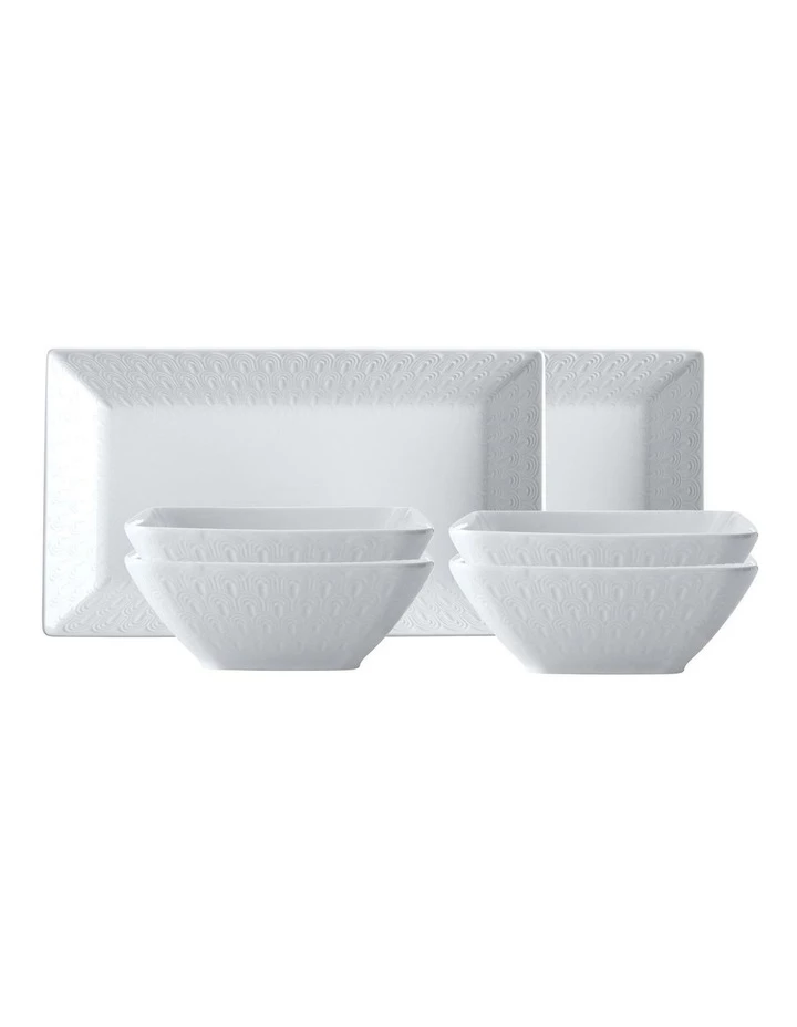 - Includes 1 x 23.5×15.5cm rectangular serving bowl, 1 x 34×20.5cm rectangular platter and 4 x 15.5x6cm square bowls