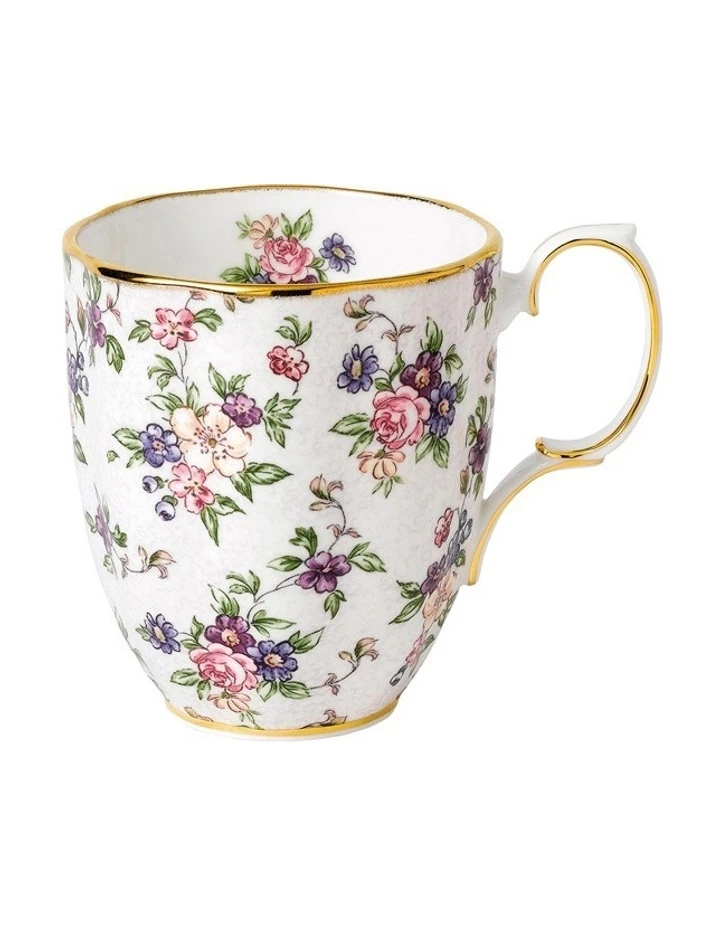 In ceramics, a chintz pattern is one where the whole surface of a shape is totally covered by the decoration to create a design that celebrates colour and image. Pretty pink roses, dainty forget-me-nots and green leaves on a crackle effect background create the epitome of the Royal Albert floral tradition.