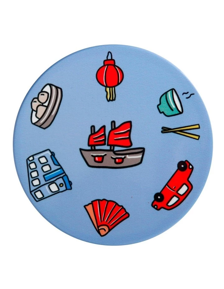 - Depicts iconic symbols of Hong Kong such as dumplings and red sail junk boats