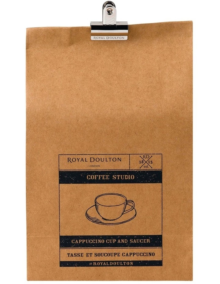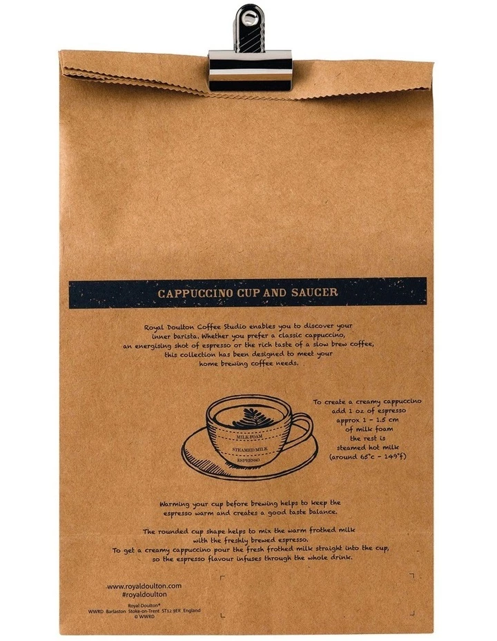Discover your inner barista with Royal Doulton Coffee Studio. Whether your prefer a classic cappuccino, an energising shot of espresso or the rich taste of a slow brew coffee, this collection has been designed to meet all your home brewing needs. The Coffee Studio Cappuccino Cup & Saucer comes in a stylish folding carton coffee style bag with bulldog clip fastener. Bring barista style coffee into your home with this stylish cup and saucer, featuring a dipped glaze design in a contempoprary colour palette. The rounded cup shape helps to mix the warm frothed milk with the freshly brewed espresso. Warming your cup before brewing helps keep the espresso warm and in good taste balance. Made from: Porcelain. Decoration Method: Hand applied impress mark and double dipped satin glaze. Height: Cup 6cm, Saucer 2.1cm. Width: Cup 10cm, Saucer 16.2cm. Capacity: 256ml. Care: Dishwasher and Microwave safe. Packaging: Folding carton coffee style bag.