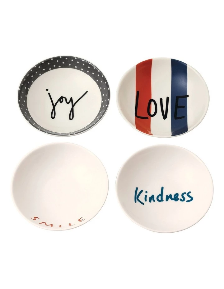 Designed by Ellen DeGeneres and crafted by Royal Doulton, these collection have handcrafted and artisanal qualities, creating a unique collection of eight different tableware designs with two colour directions in blue and neutral and a range of mix and match sets that allow you to express your own personality by combining elements of the various designs. The ED Ellen DeGeneres Crafted by Royal Doulton Joy Plates 14cm (set of 4) combine four stylish and sentimental designs into one perfect gift set. Made in porcelain, dishwasher and microwave safe and gift boxed.