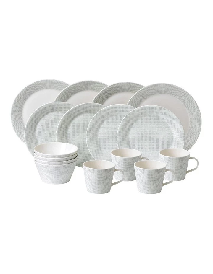 This comprehensive 16 Piece Dinner Set in Royal Doultons bold Pacific Mint colour way provides a complete table setting for four, including dinner plates, side plates, cereal bowls and mugs.