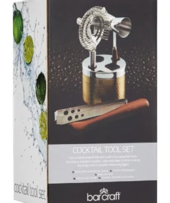 - Set includes cocktail shaker, dual spirit measuring jigger, wooden muddler, bar knife, mixing spoon, strainer and recipe book