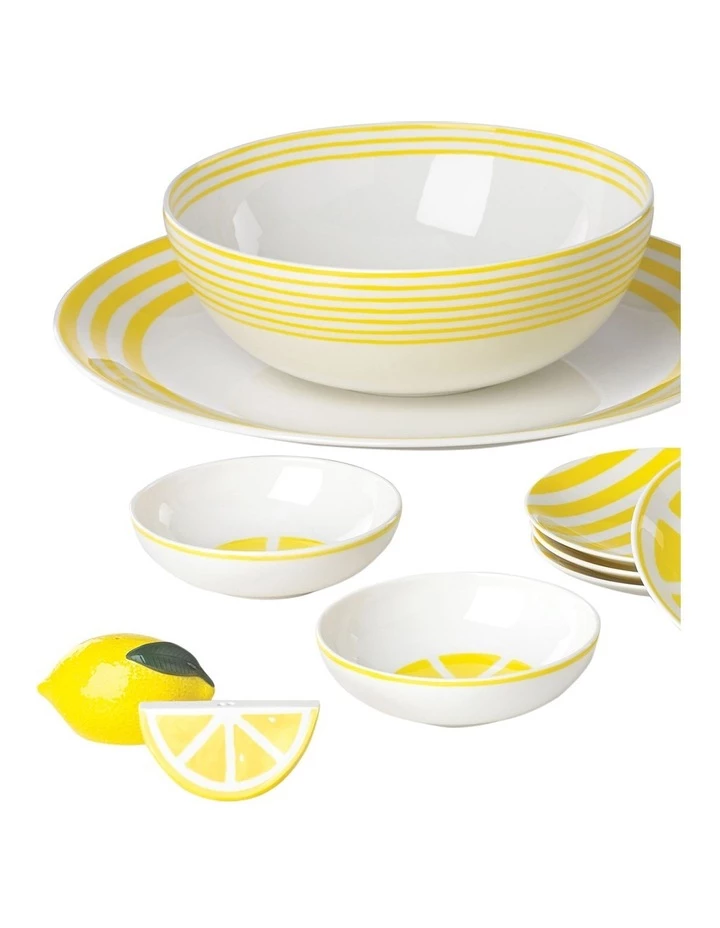 Perfect for your seafood platter the citrus-bright With A Twist Bowls liven any table and feature a cut lemon print in the centre. With a Twist marries bright yellow stripes with lemon wedge, slice, and whole fruit motifs for a fresh, complementary look.