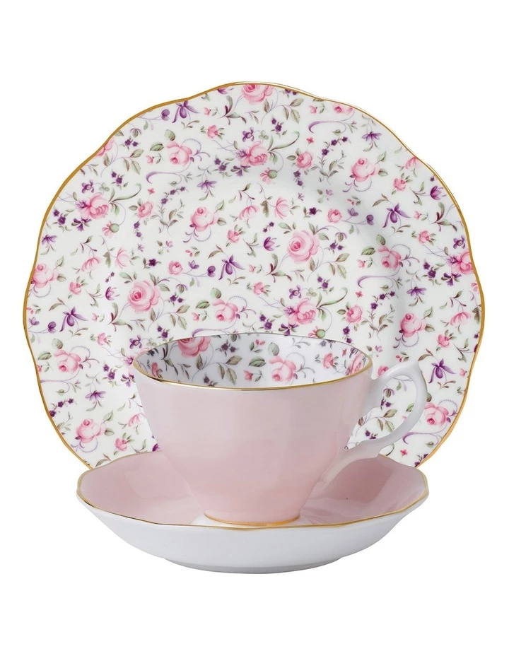 Tiny pink rosebuds decorate the Rose Confetti Teacup, Saucer & Plate set, offset with pale pink and crisp white.